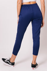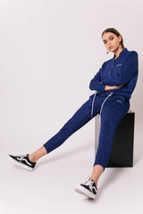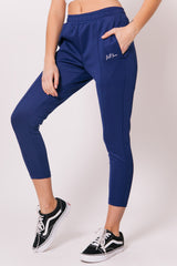 Jogging Sixth June pour femme avec logo Sixth June signature brodé à l'avant. Coupe classique fuselée (qui se resserre à partir des molets), longueur 7/8iem, poches latérales, détail surpiqué à l'avant et élastique à la taille. Modèle bleu.