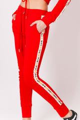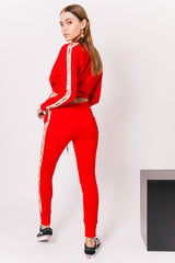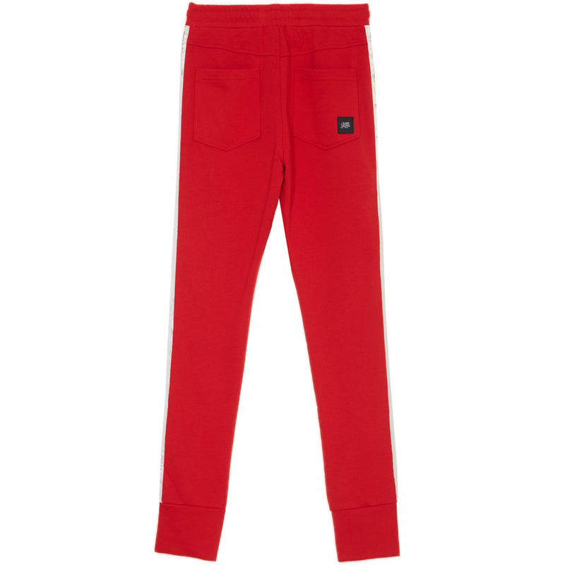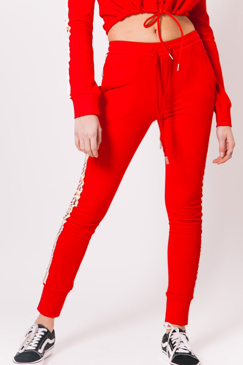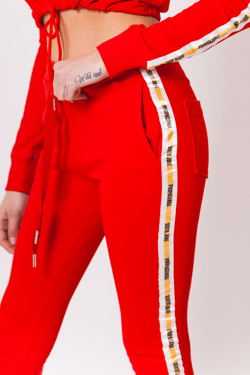 Jogging Sixth June pour femme avec bandes bicolores latérales et "Propaganda", "Sixth June" imprimé. Coupe moulante, élastique à la taile avec cordons de serrage, poches latérales et arrières. Modèle rouge.