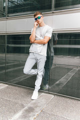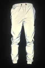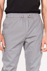 Pantalon de jogging pour homme de marque Sixth June. Matière entièrement réfléchissante (effet brillant à la lumière). Elastique à la base, cordon de serrage à la taille, deux poches latérales, deux poches arrières. Coupe classique. Modèle gris clair.