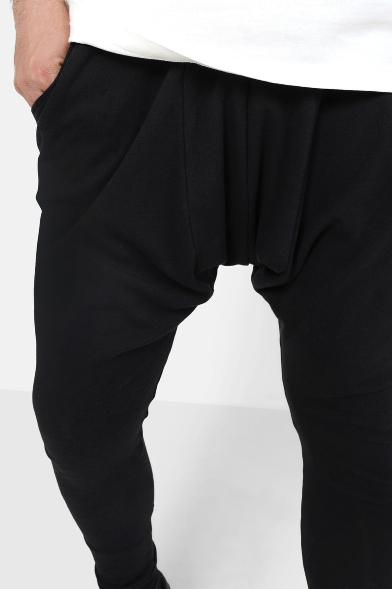 Coupe ample à l'entrejambe, coupe slim au niveau des mollets, cordon de serrage à la taille. Modèle noir uni.