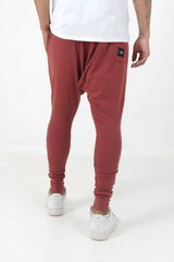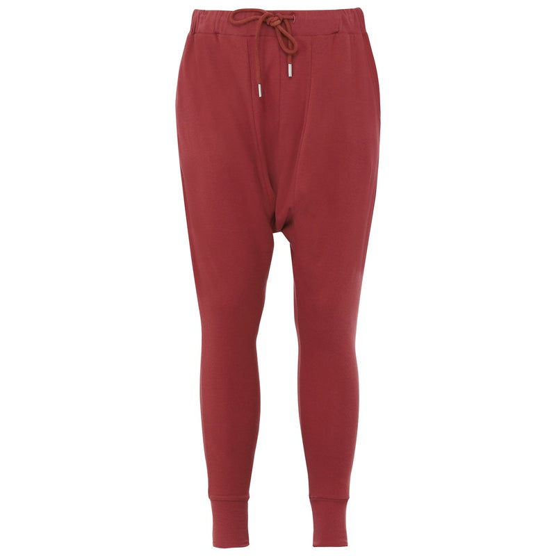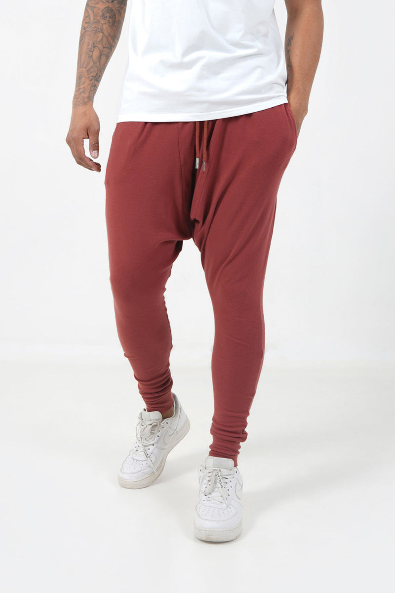 Coupe ample à l'entrejambe, coupe slim au niveau des mollets, cordon de serrage à la taille. Modèle bordeaux "marsala" uni.