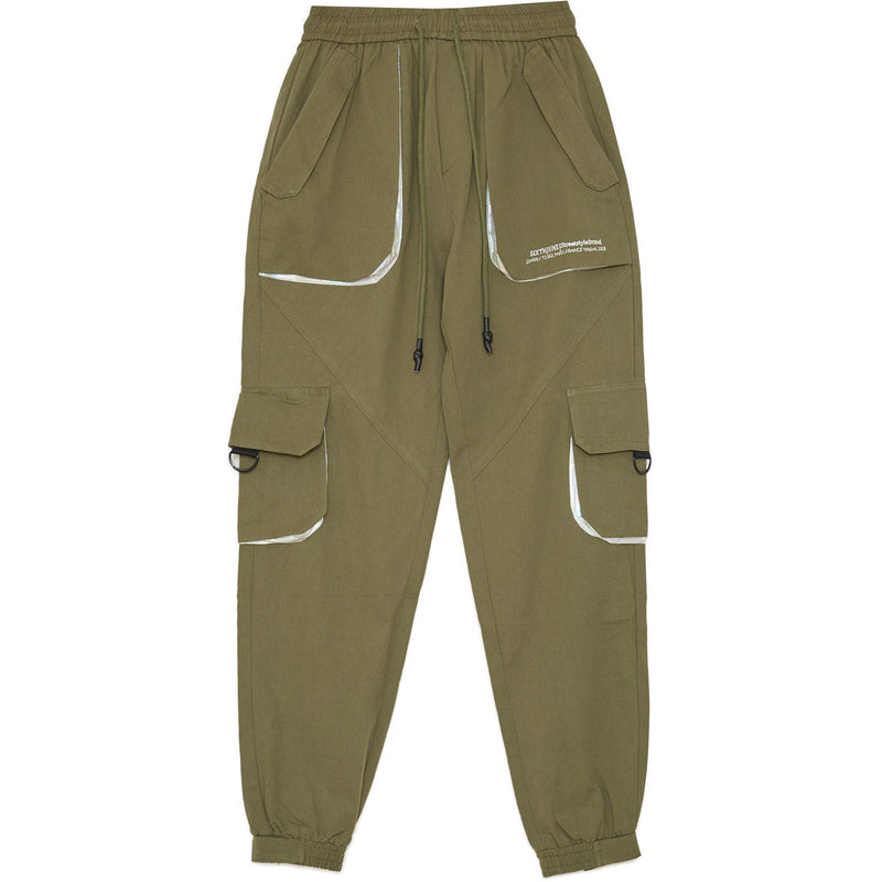 Poches au niveau du genou avec boucles, poches arrières, détail nacré autour des poches, élastique à la taille et aux chevilles avec scratch.