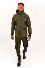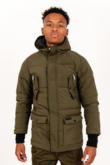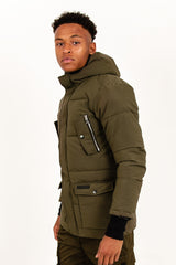 Doudoune mi-longue pour homme de marque Sixth June. Poches avec détails à bouton et fermetures à zip au niveau de la poitrine. Effet matelassé et rembourré. Fermeture centrale à zip et boutons. Capuche non amovible, bords-côtes aux poignets. Coupe classique. Modèle kaki.