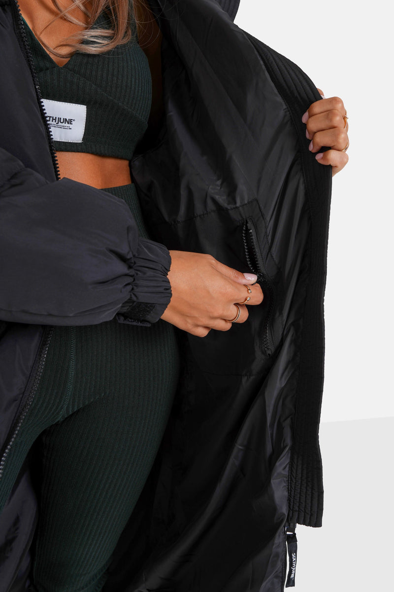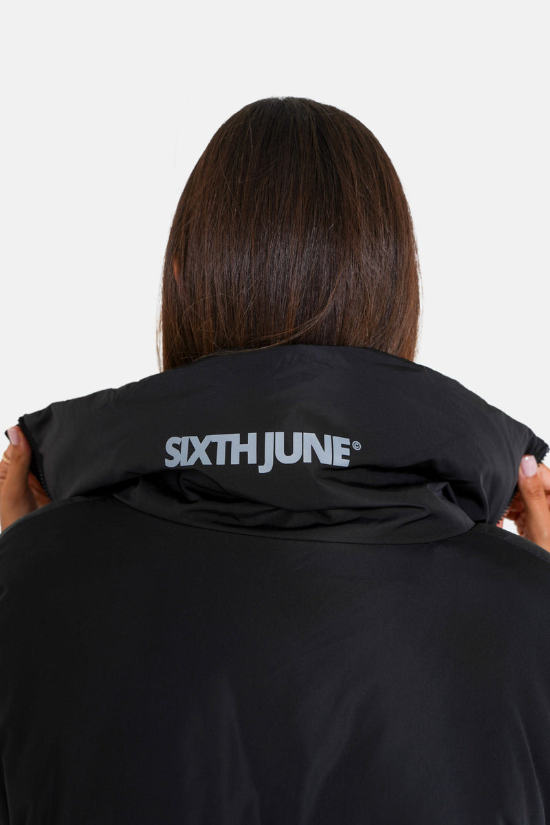 Effet matelassé, col montant imprimé SIXTH JUNE au niveau de la nuque. Poches latérales avec fermeture à zip, poche intérieur et fermeture centrale à zip également, logo sur patch en caoutchouc à l'avant sur le bas au niveau de la base.