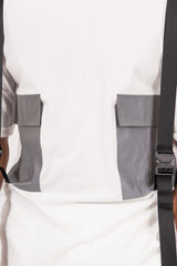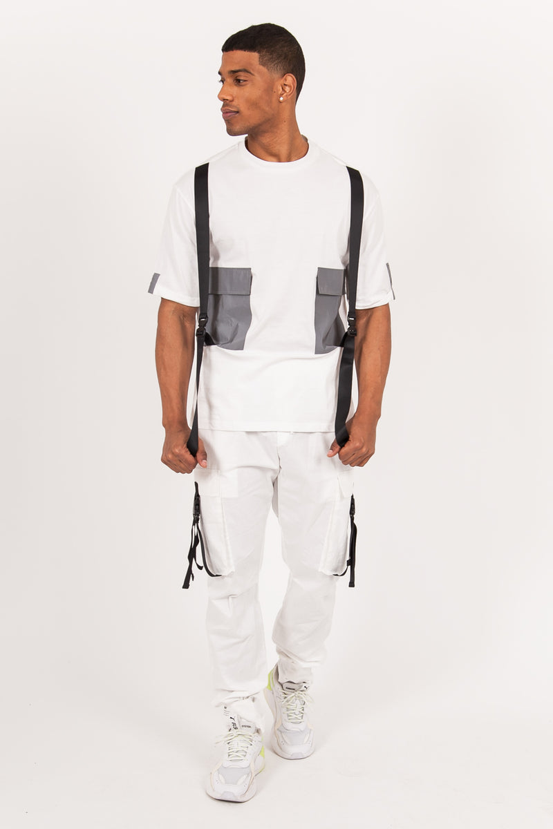T-shirt à manches courtes pour homme de marque Sixth June. Deux poches réfléchissantes à l'avant avec sangles détachables. Manches mi-longues avec patchs réfléchissants. Coupe ample. Modèle blanc.