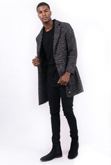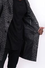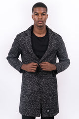 Manteau long Sixth June pour homme en matière chiné. Coupe ajustée, col à revers, fermeture boutonnée, poches latérales, poche intérieure et fente à l'arrière. Modèle noir chiné.