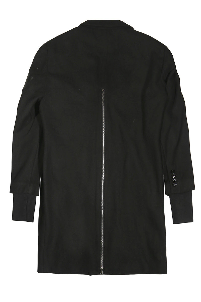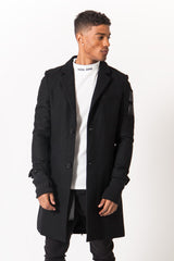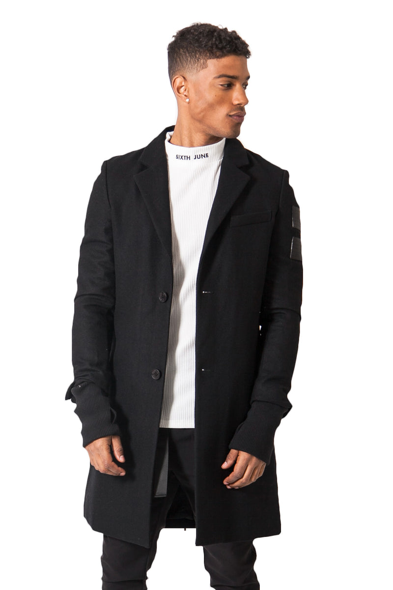 Manteau mi-long noir Sixth June Homme. Une fausse poche pochette sur la poitrine. Deux bandes noir sur l’avant-bras gauche. Doubles manches côtelées noires avec trous pour le pouce. Poche intérieure.