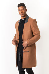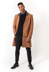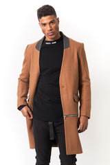 Manteau mi-long camel Sixth June Homme. Col gris. Zips mode. Deux poches tiroirs. Poche intérieure.