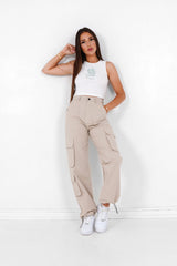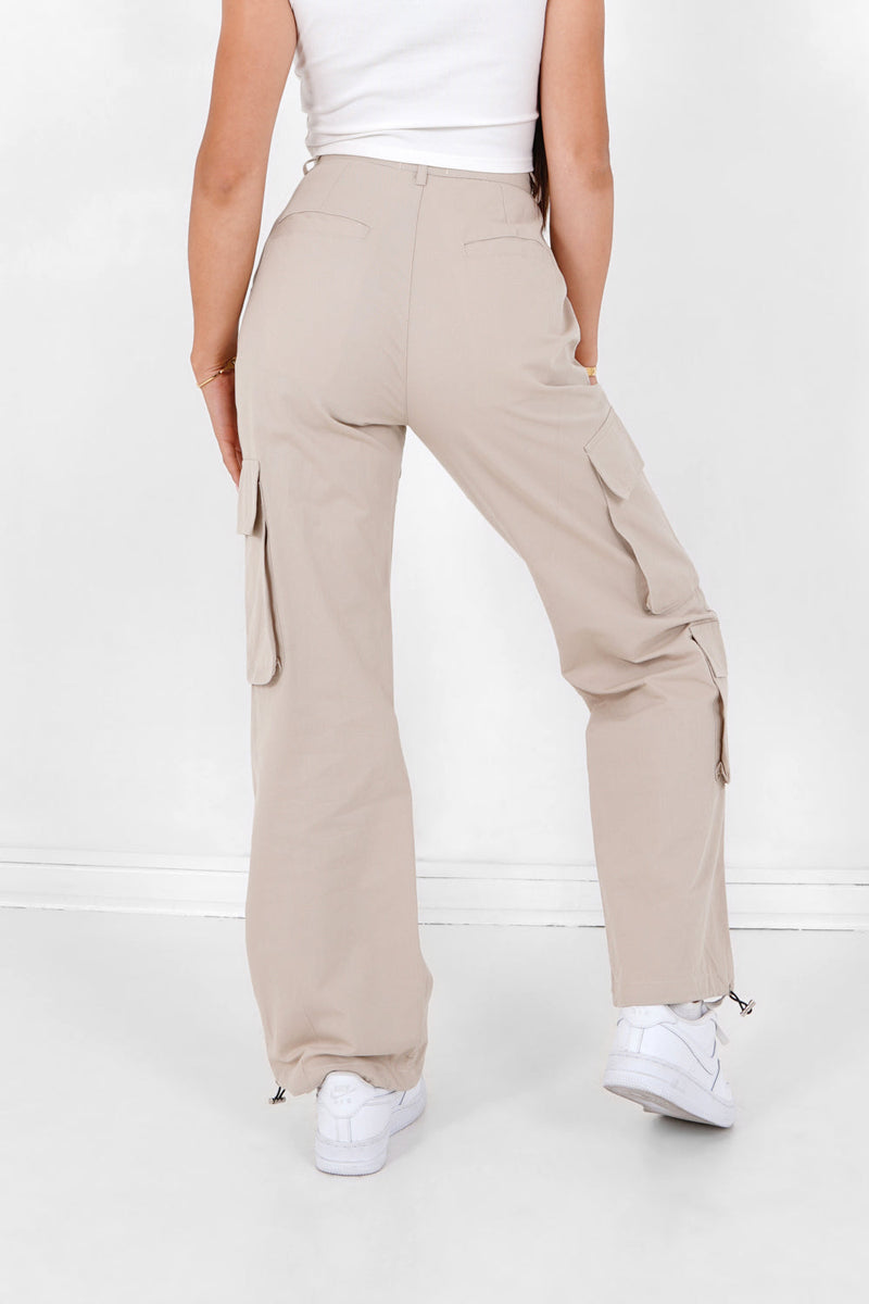 Poches arrières, fermeture à zip et bouton, passant pour ceinture, cordon de serrage aux chevilles.