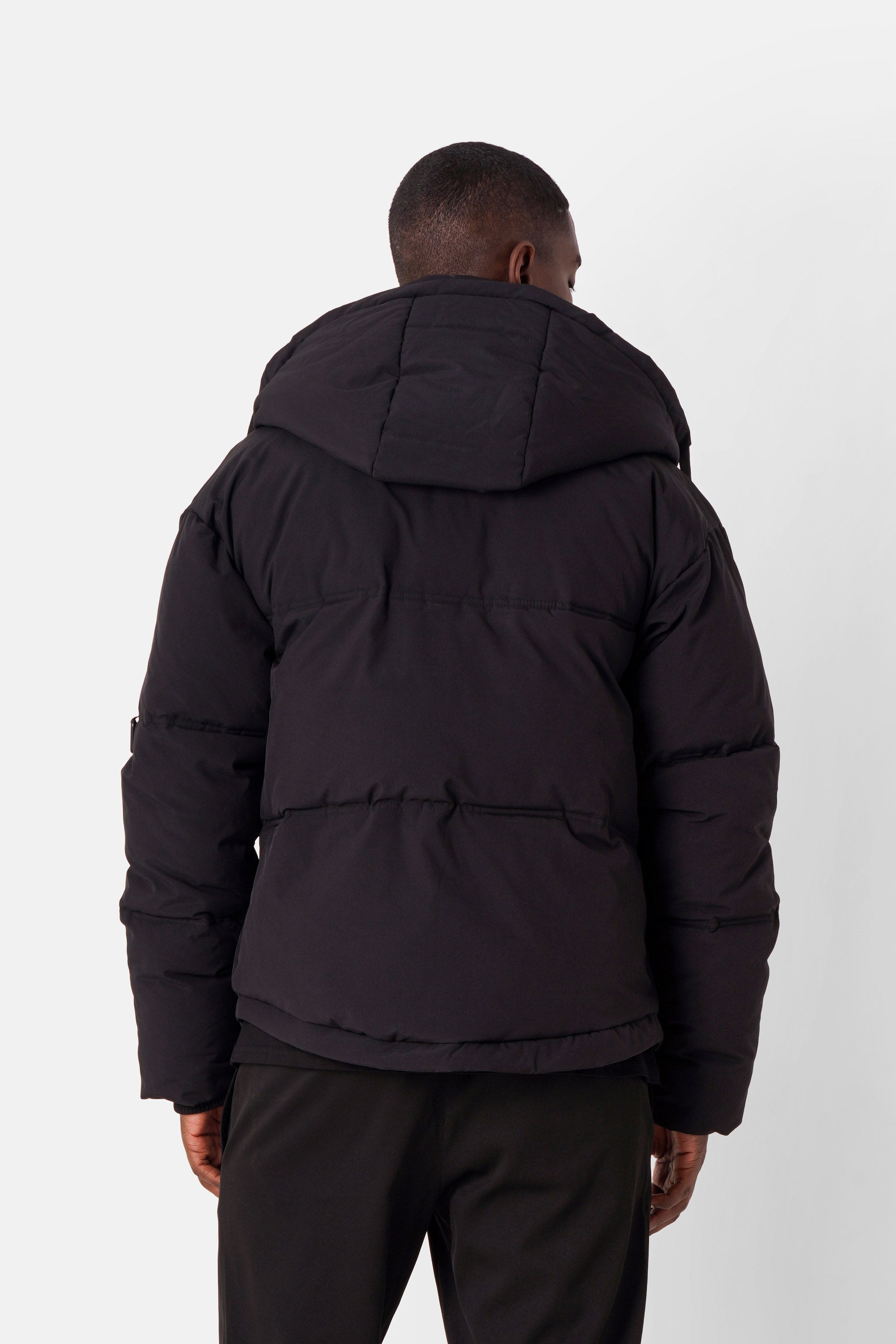 Effet matelassé et rembourré, poches latérales avec fermeture à boutons de pression, poche intérieure, fermeture centrale à zip.