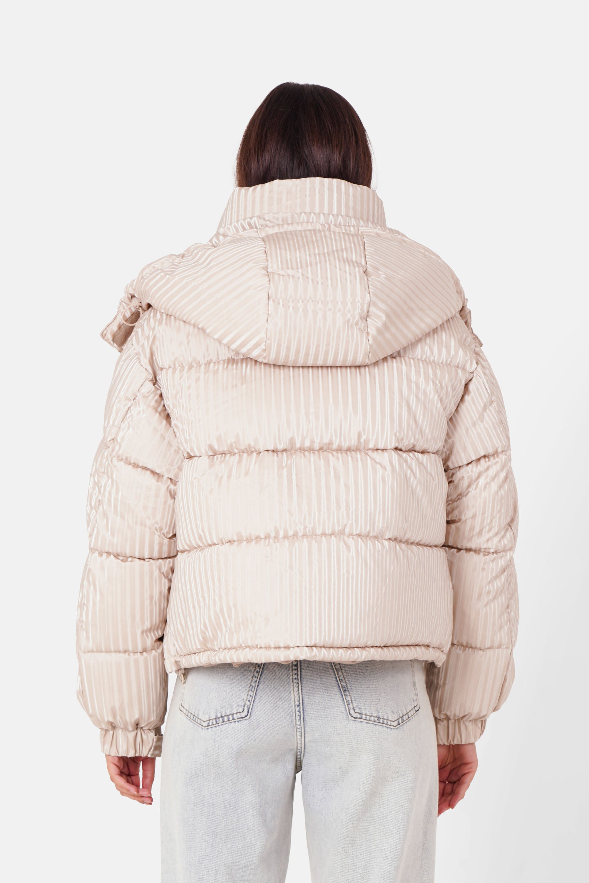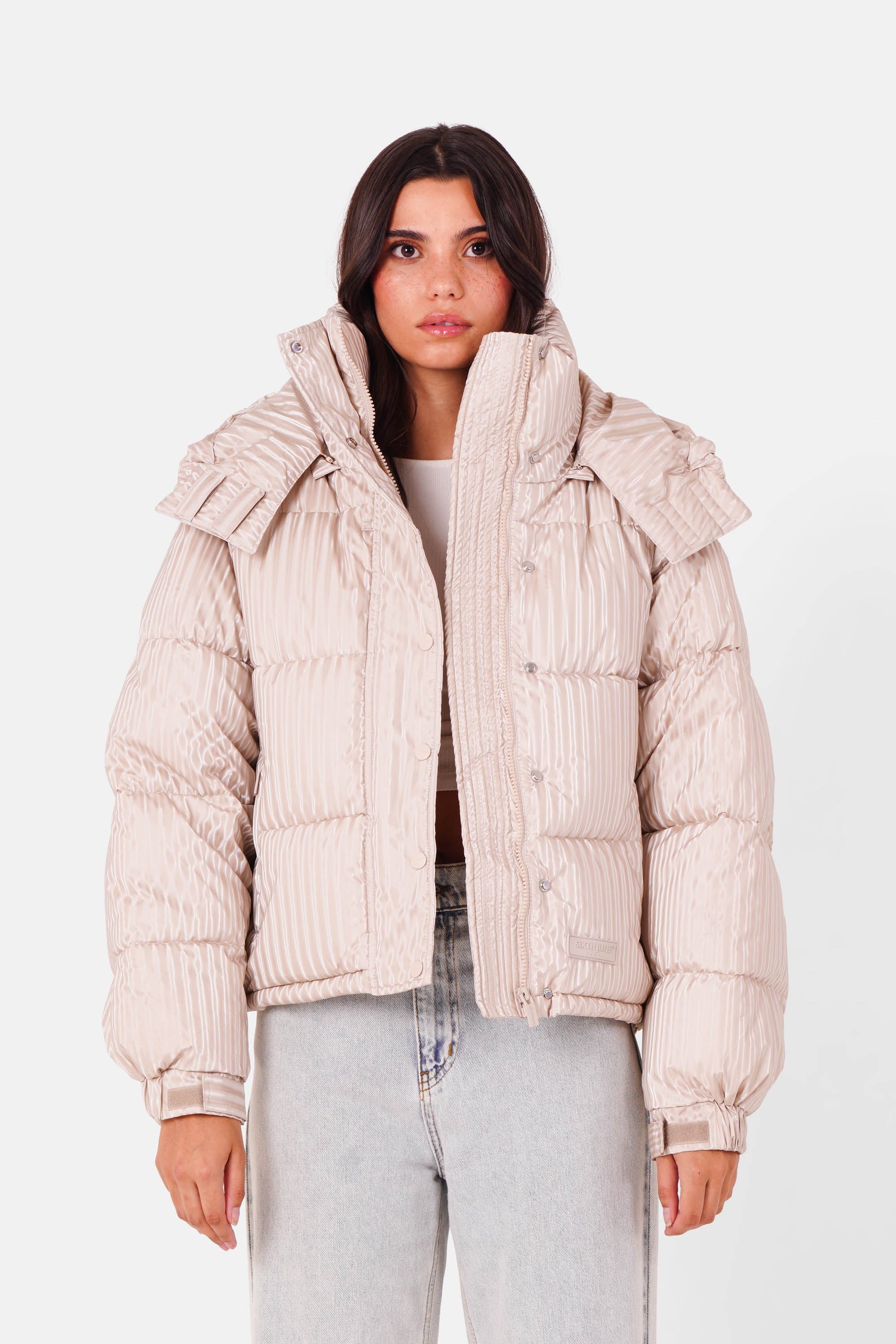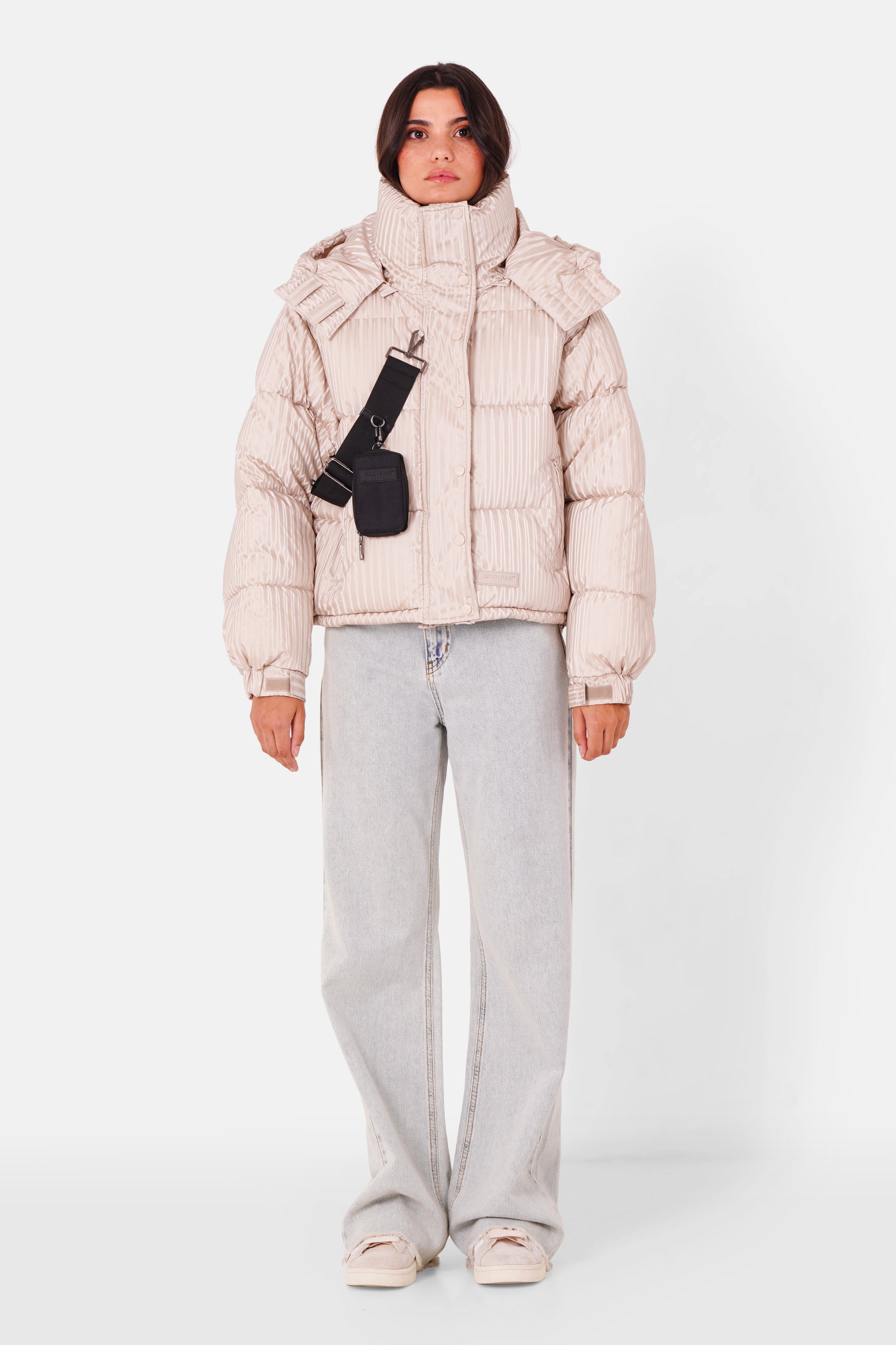 Matière effet brillant à la lumière, tissu matelassé ondulé, logo en relief sur patch en gomme près de la base.
