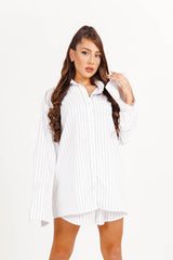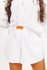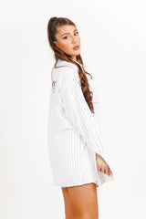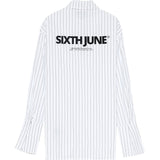Chemise à manches longues pour femme de marque Sixth June. Imprimé à rayures sur l'ensemble. Imprimé SIXTH JUNE à l'arrière avec texte. Coupe classique. Modèle blanc.