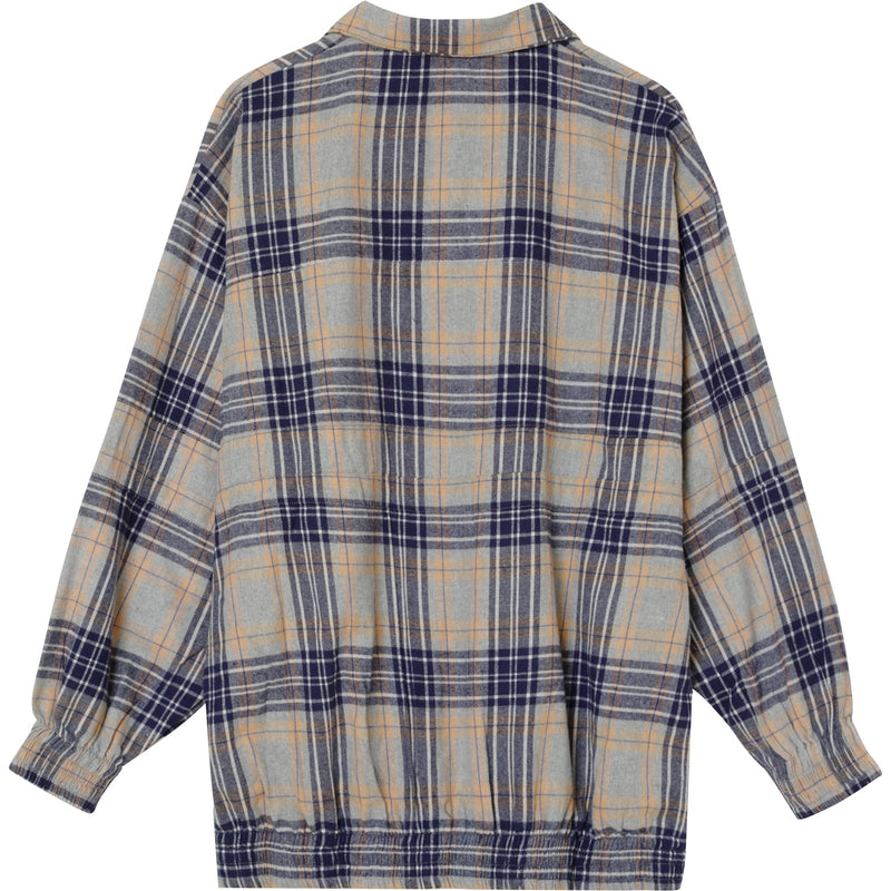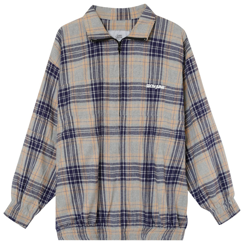 Imprimé tartan bleu marine, beige et orange. Tissus léger et doux, fermeture éclair, logo imprimé au niveau de la poitrine, poignets et taille élastiques, poches latérales.