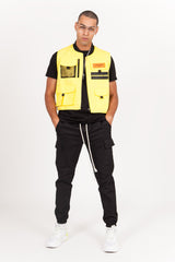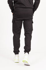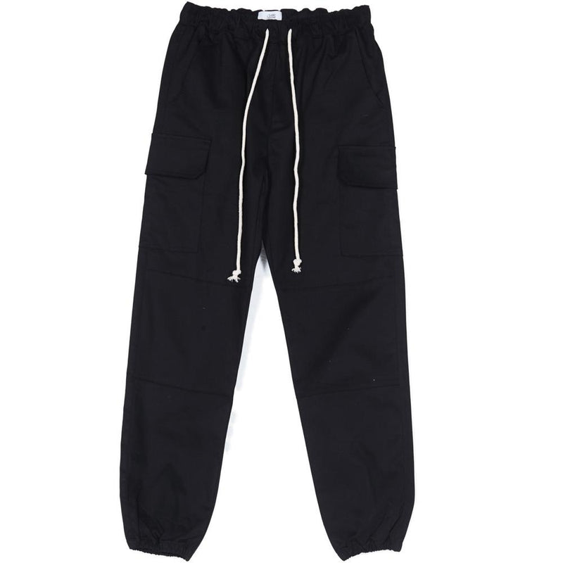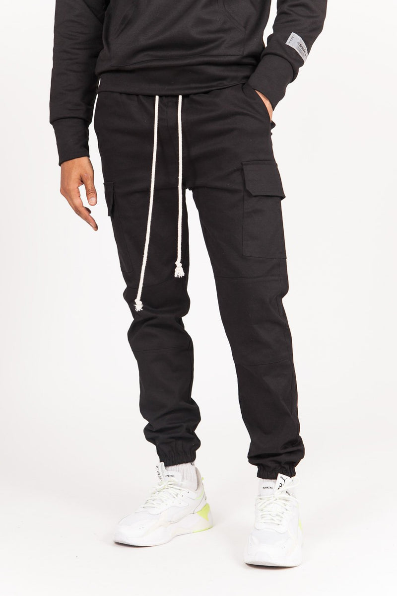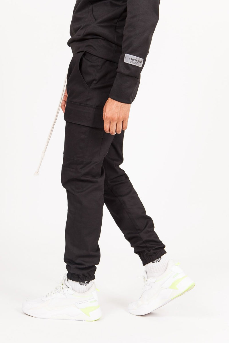 Pantalon cargo Sixth June pour homme en sergé de coton. Coupe classique et 7/8, élastique à la taille avec cordons de serrage oversize, poches cargo et élastiques au niveau des chevilles. Modèle noir.