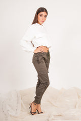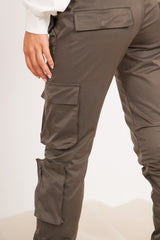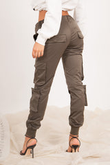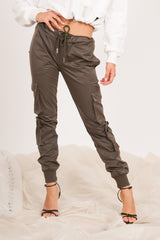 Pantalon cargo pour femme de marque Sixth June. Poches cargo, poche avec zip, poches latérales. Imprimé Sixth June sur la poche avant gauche, cordon de serrage à la taille, élastique à la base et aux chevilles. Coupe ajustée. Modèle kaki.