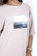 Robe t-shirt manches courtes pour femme de marque Sixth June. Image imprimé océan au centre, inscription "Sixth June streetstyle brand" en dessous. Coupe courte et oversize. Modèle beige.