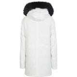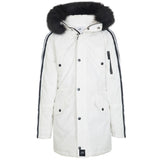 Parka homme Sixth June avec une capuche dotée d'une fausse fourrure (amovible) et des bandes le long des manches. Coupe ajustée avec un cordon de serrage intérieur à la taille, une double fermeture (zip et boutons) et des bords-côtes au niveau des manches. Deux poches latérales, deux poches poitrines, une poche à zip sur le bras gauche et une poche intérieure. Tissu haute densité, rembourré et déperlant. Modèle blanc avec des bandes bicolores noires et blanches.