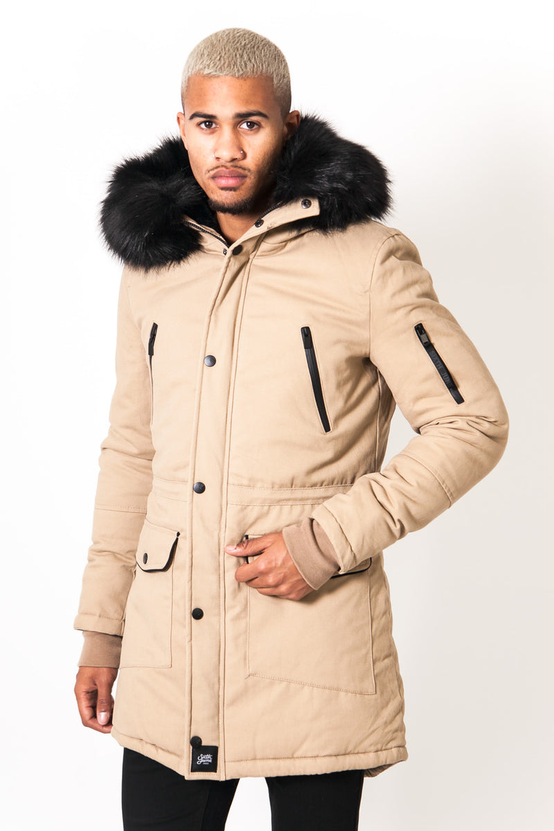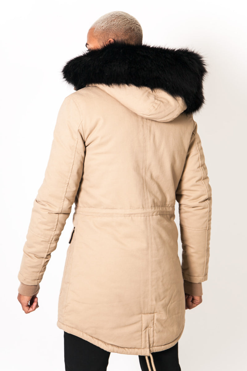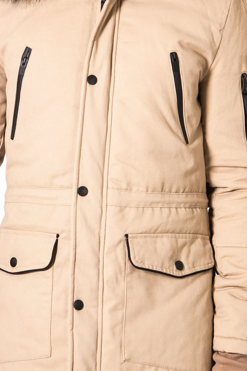 Parka pour homme de marque Sixth June. Intérieur en matière duveteuse, douce et chaude. Capuche avec fausse fourrure amovible (grand format). Poches à l'avant avec fermeture à zip et à boutonnée, poche intérieure, cordon de serrage intérieure à la taille, bords-côtes aux poignets. Coupe classique. Modèle beige noir.