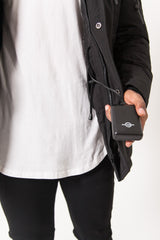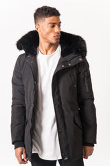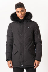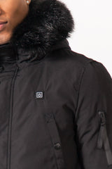 Parka Sixth June pour homme avec technologie chauffante, grâce à un tissu intelligent qui diffuse et retient la chaleur à l'intérieur de la veste. Bouton de démarrage (LED) à l’avant, batterie non fournie et rechargeable sur un port USB. Tissu haute densité, rembourré et déperlant. Coupe ajustée, capuche avec fausse fourrure amovible et doublée en polaire, cordons de serrage intérieur à la taille, poches latérales et poches poitrines boutonnées, poche zippée sur le bras gauche, poches intérieures, double fermeture (zip et boutons à pression) et bords-côtes au niveau des poignets. Modèle noir avec fourrure noire.