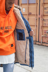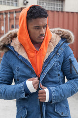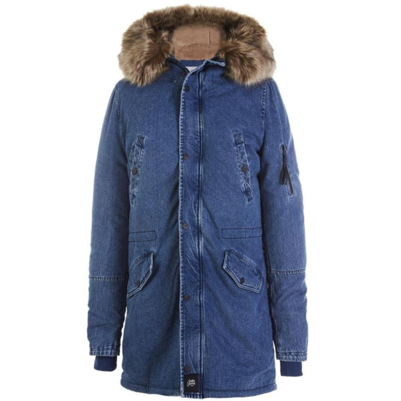 Parka homme Sixth June avec un tissu en jean, une fausse fourrure (amovible) sur la capuche, et une doublure douce et chaude. Coupe classique ajustée avec un cordon de serrage intérieur à la taille et une double fermeture (zip et boutons). Deux poches latérales, deux poches poitrines, une poche à zip sur le bras gauche et une poche intérieure avec un tissu doux. Tissu haute densité, rembourré et déperlant. Modèle bleu avec fourrure et doublure beiges.