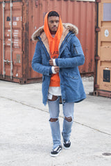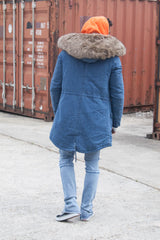Parka jean denim large fourrure bleu beige