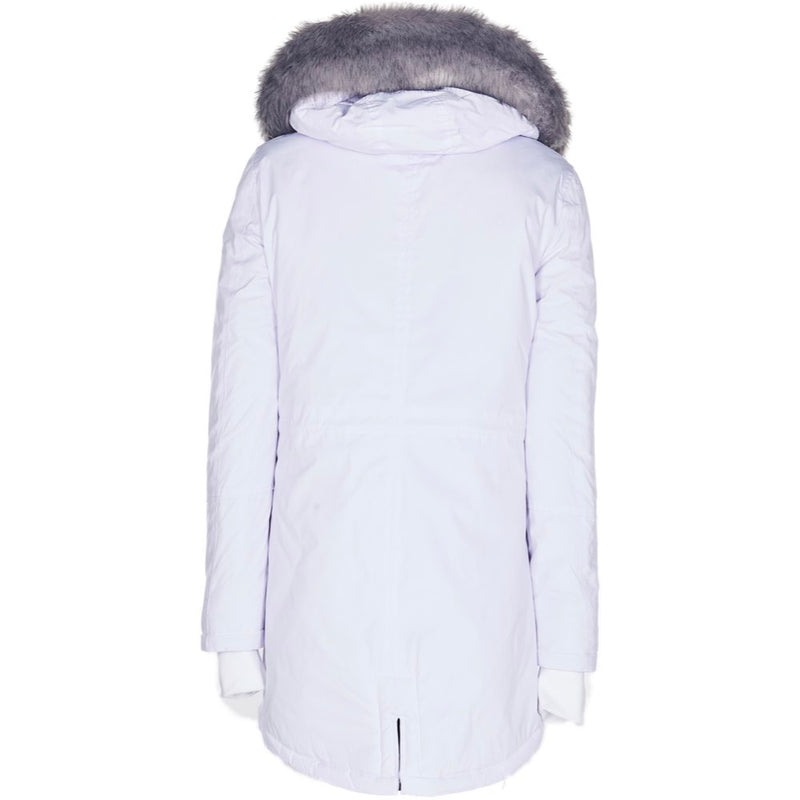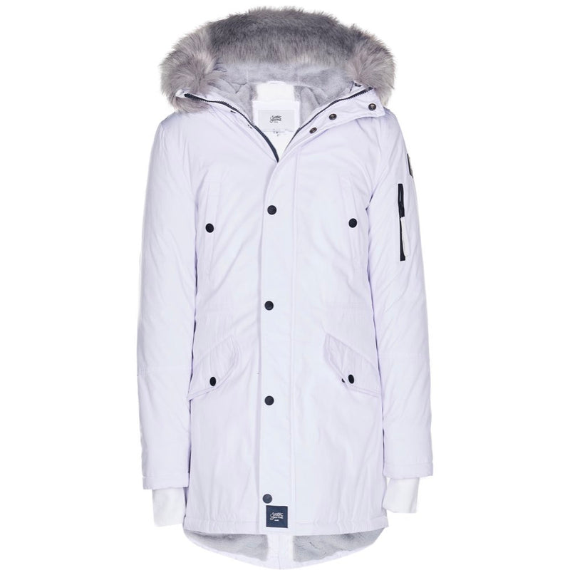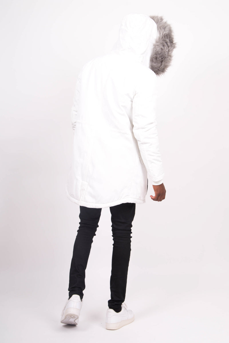 Capuche dotée d'une fausse fourrure (amovible), cordon de serrage intérieur au niveau de la taille, double fermeture (zip et boutons) et des bords-côtes au niveau des manches, deux poches latérales, deux poches poitrines, une poche à zip sur le bras gauche et une poche intérieure avec un tissu doux.