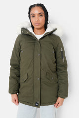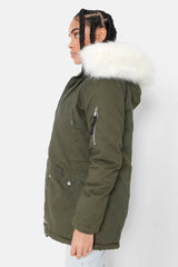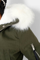 Doublure en fausse fourrure douce et chaude, intérieur capuche de la même matière, cordon de serrage intérieur à la taille, double fermeture: zip et boutons, bords-côtes au niveau des manches, poches latérales, poches poitrines, 1 poche à zip sur le bras gauche et une poche intérieure avec un tissu doux.