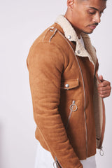 Veste pour homme de marque Sixth June. Style aviateur avec col à revers en sherpa. Fermeture asymétrique, poches latérales à fermeture à zip. Détail avec zip sur la manche gauche, fermeture au niveau des poignets. Coupe classique, légèrement ajustée. Modèle beige.