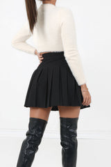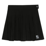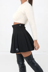 Jupe pour femme de marque Sixth June. Tissu plissé, logo imprimé sur patch soyeux à l'avant. Fermeture à zip et bouton sur le côté. Coupe classique et courte. Modèle noir.