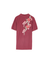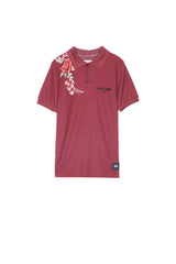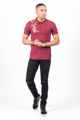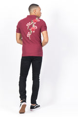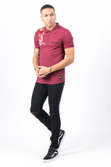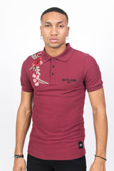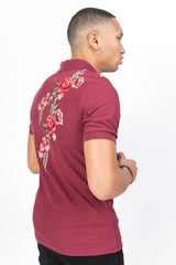 Polo homme Sixth June avec des roses brodées à l'avant et à l'arrière. Coupe ajustée, col boutonné et élastique au niveau des manches. Modèle bordeaux.