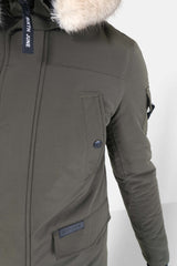 Poches avant avec fermeture à bouton et aimant, fermeture centrale à zip et aimantée, poche avec sangle sur le bras avant gauche, poche intérieure, bords-côtes aux poignets.