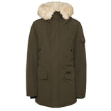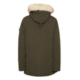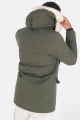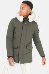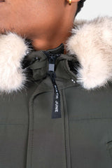 Capuche ajustable (non amovible) avec fausse fourrure amovible.