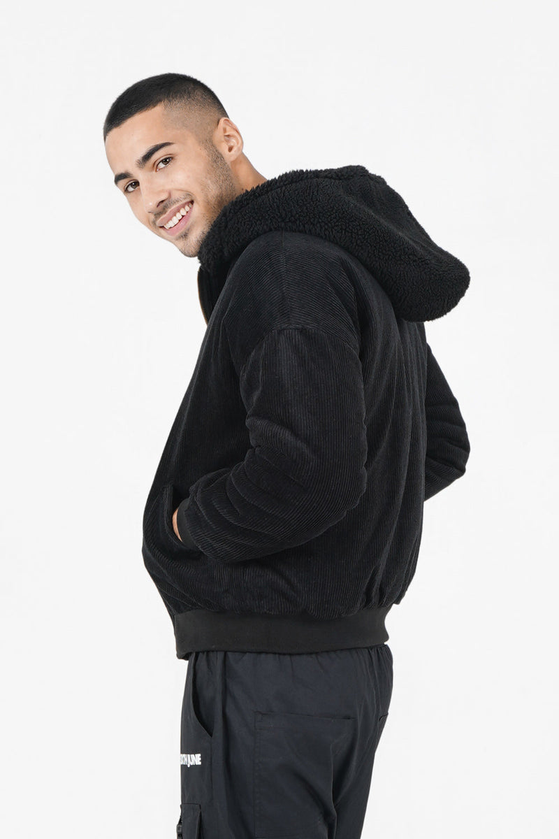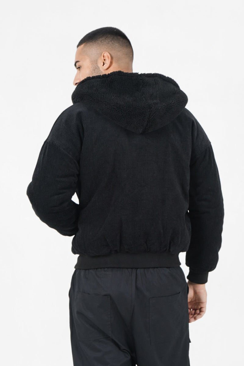 Réversible avec 1 côté en matière imitation sherpa et tissu épais et 1 côté en matière côtelée. Capuche intérieure et extérieure en sherpa, fermeture zippée, poches latérales (version côtelée).