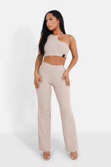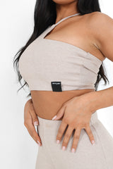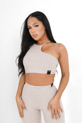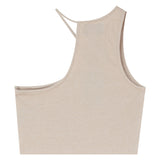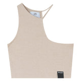 Tissu côtelé, bretelle d'un côté et fine bretelle de l'autre avec effet épaule dénudée. Logo tissé sur patch à la base.