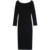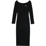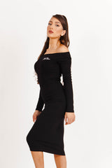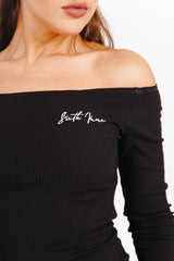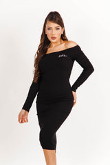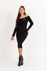 Robe à manches longues pour femme de marque Sixth June. Epaules dénudées, esprit col bateau. Matière côtelée et chaude. Broderie Sixth June sur la poitrine. Coupe moulante, près du corps, longueur midi. Modèle noir.