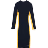 Robe femme Sixth June avec des bandes le long du corps. Coupe moulante, longueur midi, manches longues. Modèle noir avec bandes jaunes moutarde.