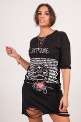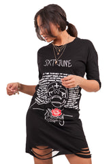 Robe t-shirt Sixth June avec imprimé tête de mort, roses, et inscriptions à l'avant, et des déchirures en bas. Coupe large et épaules tombantes. Modèle noir avec imprimés blanc et rouge.