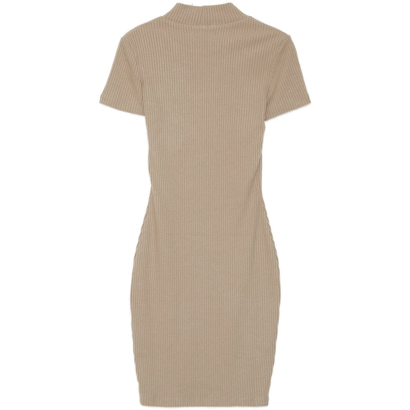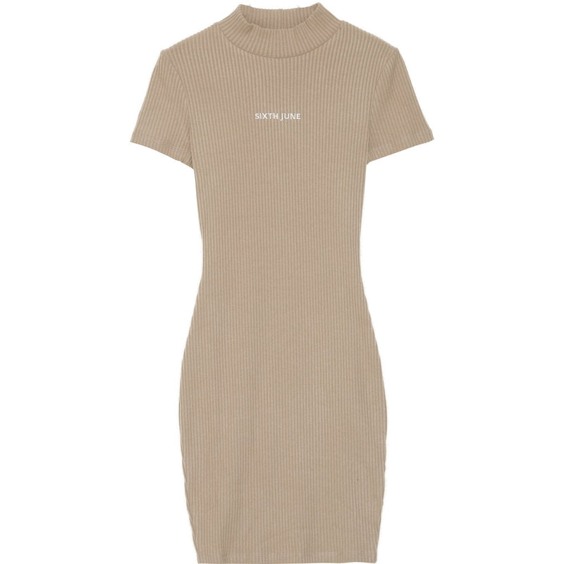 Robe à manches courtes pour femme de marque Sixth June. Matière côtelée et douce, Sixth June brodé à l'avant, col montant. Coupe ajustée, très près du corps, longueur midi. Modèle beige.