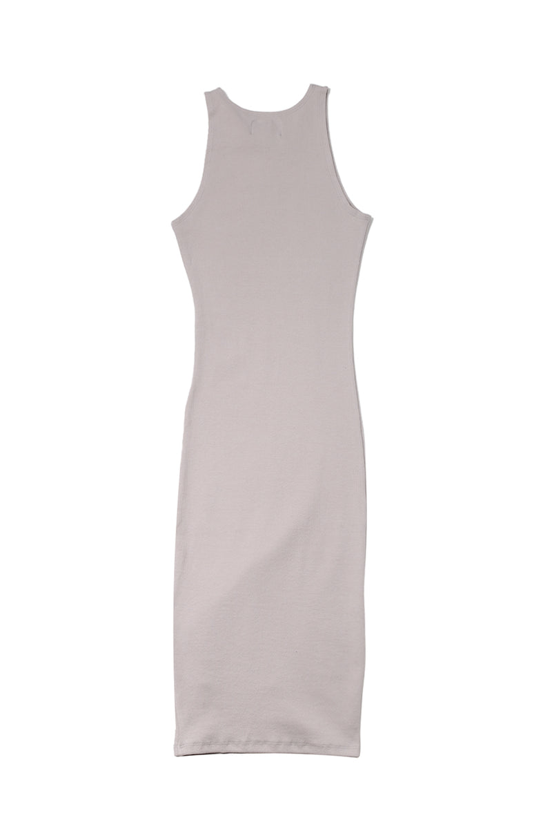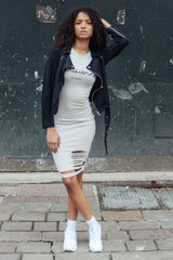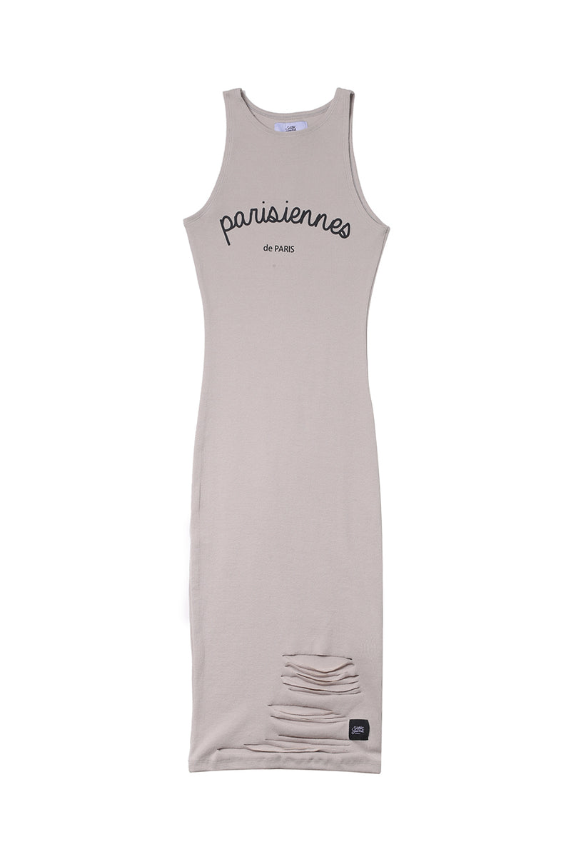 Robe longue gris clair Sixth June Femme. Inscription à l'avant, Parisiennes de Paris. Effet destroy en bas, à l'avant. Coupe mi-longue, moulante.