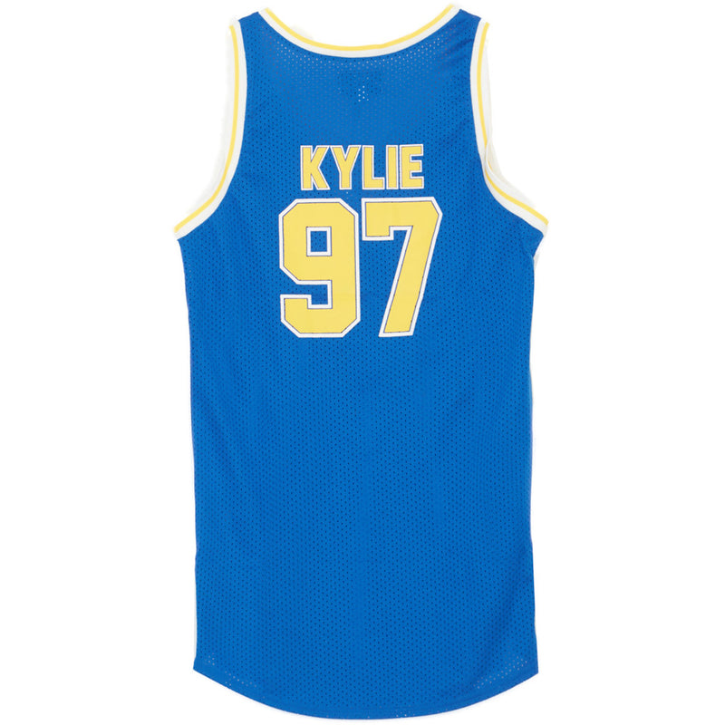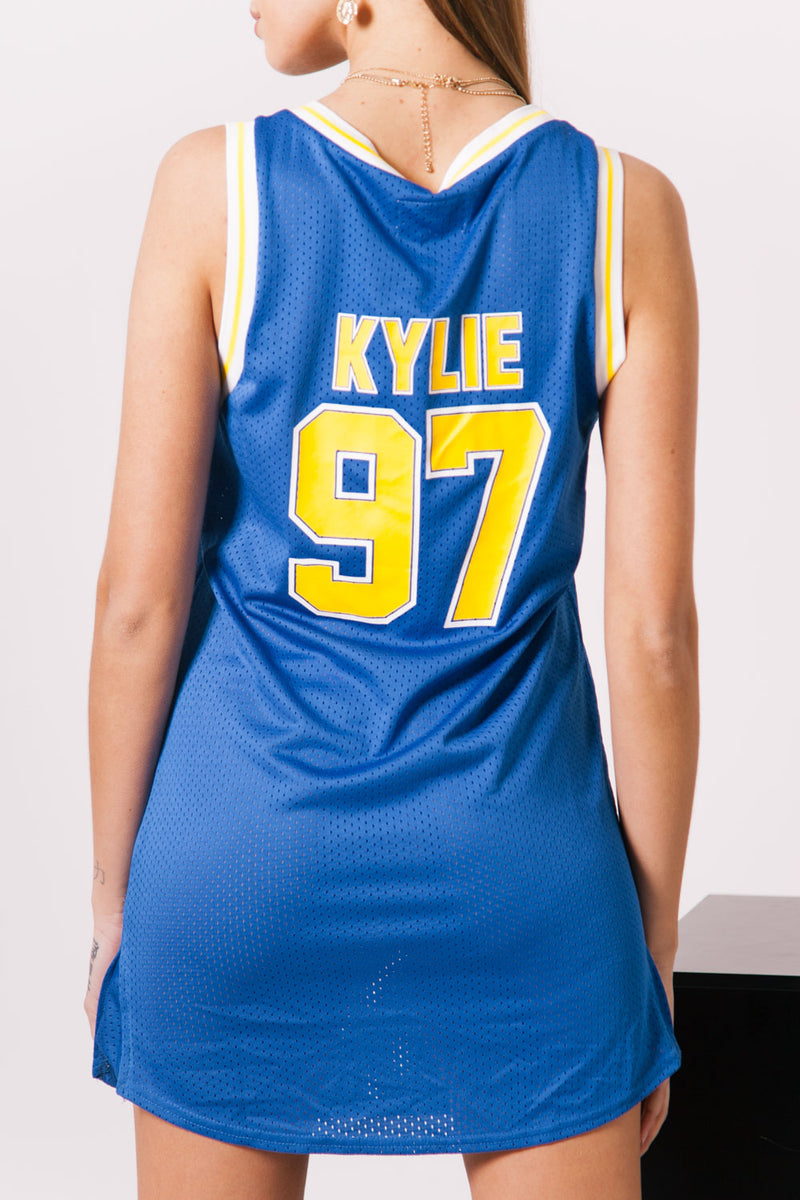 Robe T-Shirt en mesh Sixth June pour femme inspiration maillot de NBA. Coupe classique et courte, base arrondie, "Kylie 97" imprimé à l'arrière et "Sixth June" à l'avant. Modèle inspiré du maillot de NBA des Golden State Warriors (jaune, bleu,blanc).