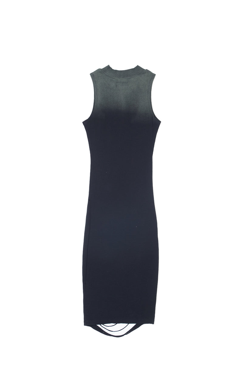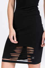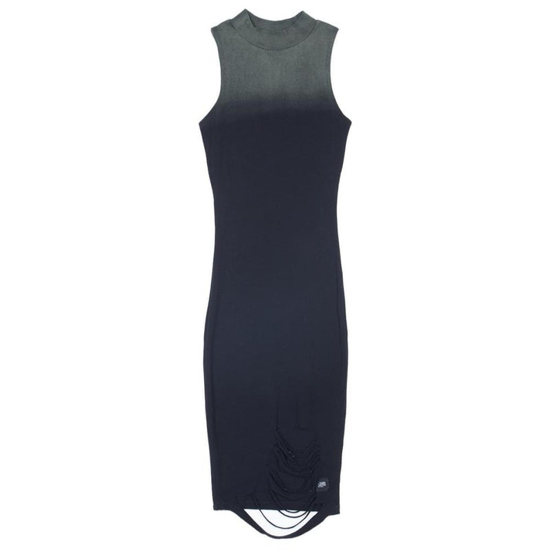 Robe Sixth June pour femme avec effet destroy à la base à l'avant. Coupe moulante, longueur midi, sans manches, effet dégradé sur la partie supérieure, col montant. Modèle noir et kaki.
