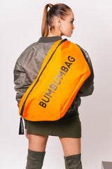 Sac banane extra large Bumbumbag pour homme et femme, avec logo imprimé à l'avant. Zip, tirette avec slogan, bandoulière ajustable et fermoir sécurisé. Modèle orange. Dimensions : 70cm.