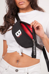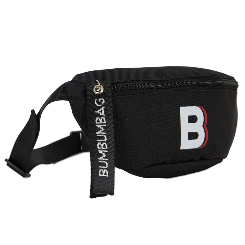 Sac banane Bumbumbag pour homme et femme, avec logo imprimé à l'avant. Zip, tirette avec slogan, bandoulière ajustable et fermoir sécurisé. Modèle noir. Dimensions : 23x6cm.