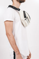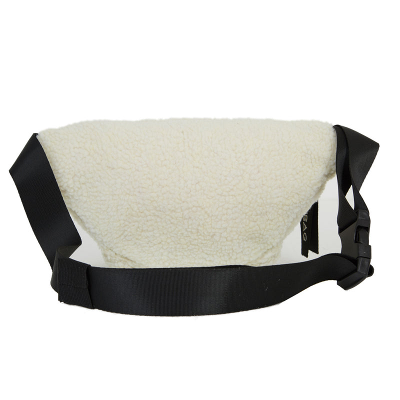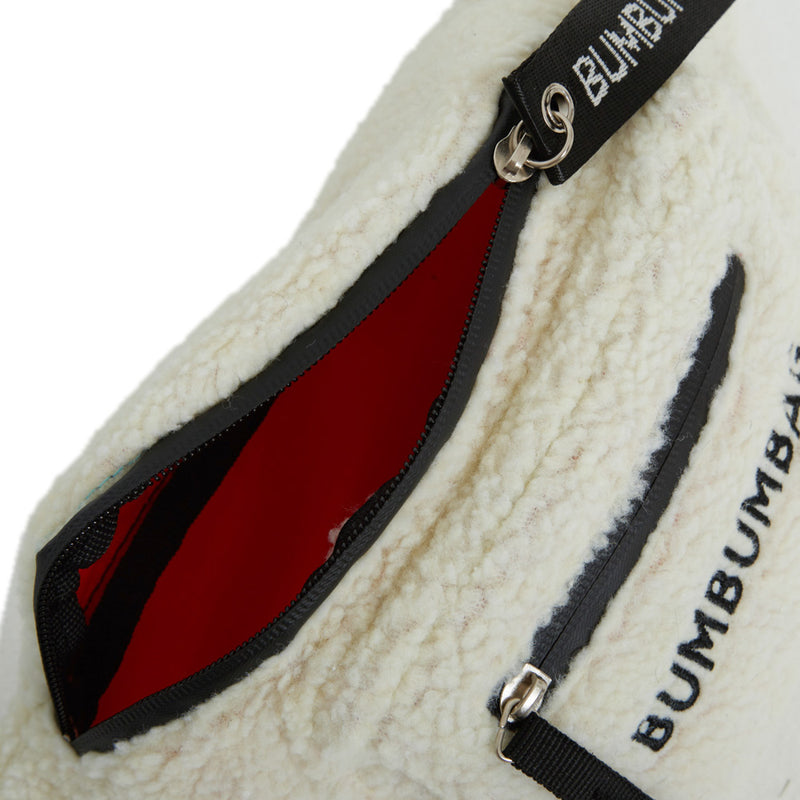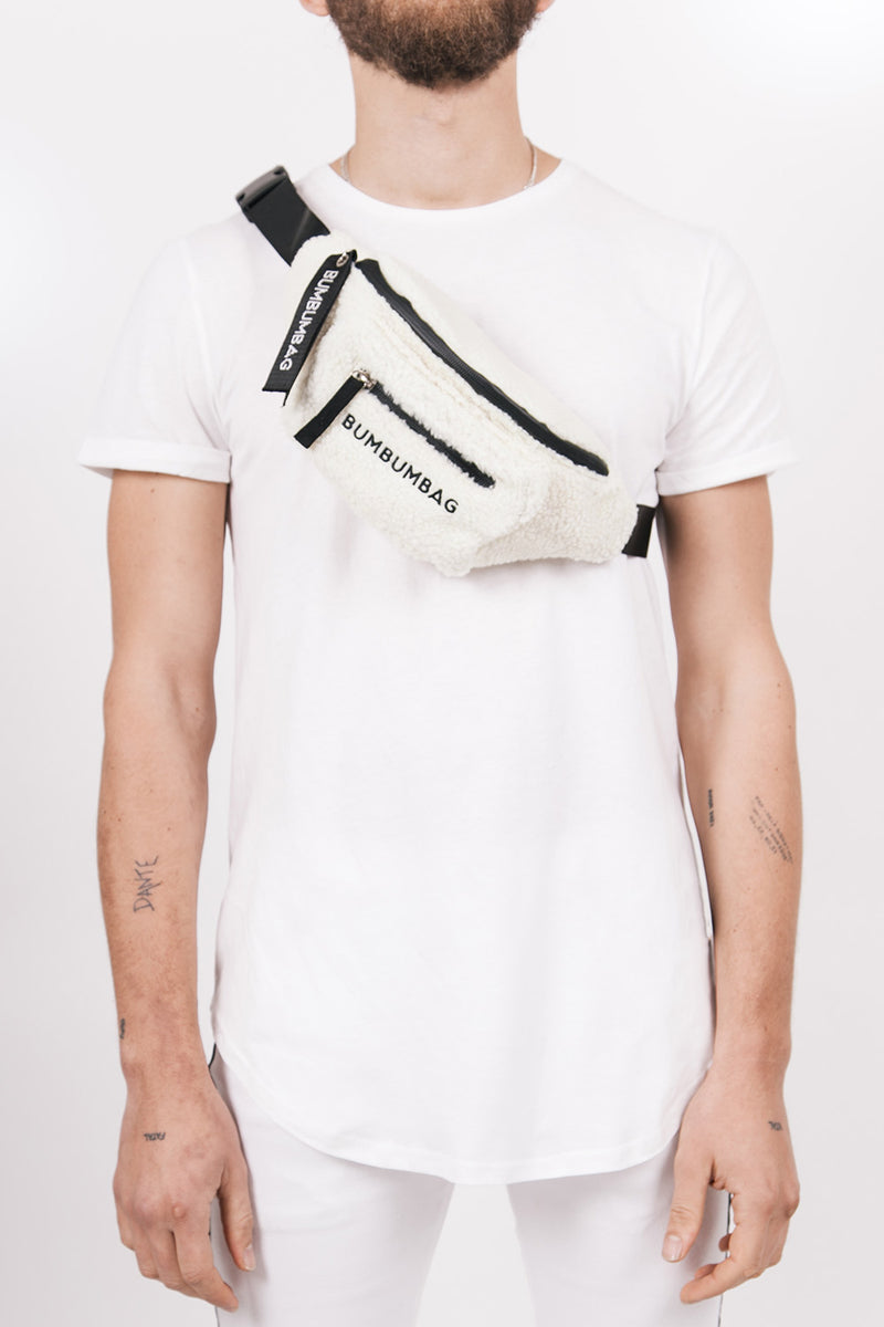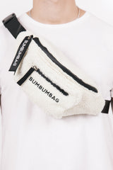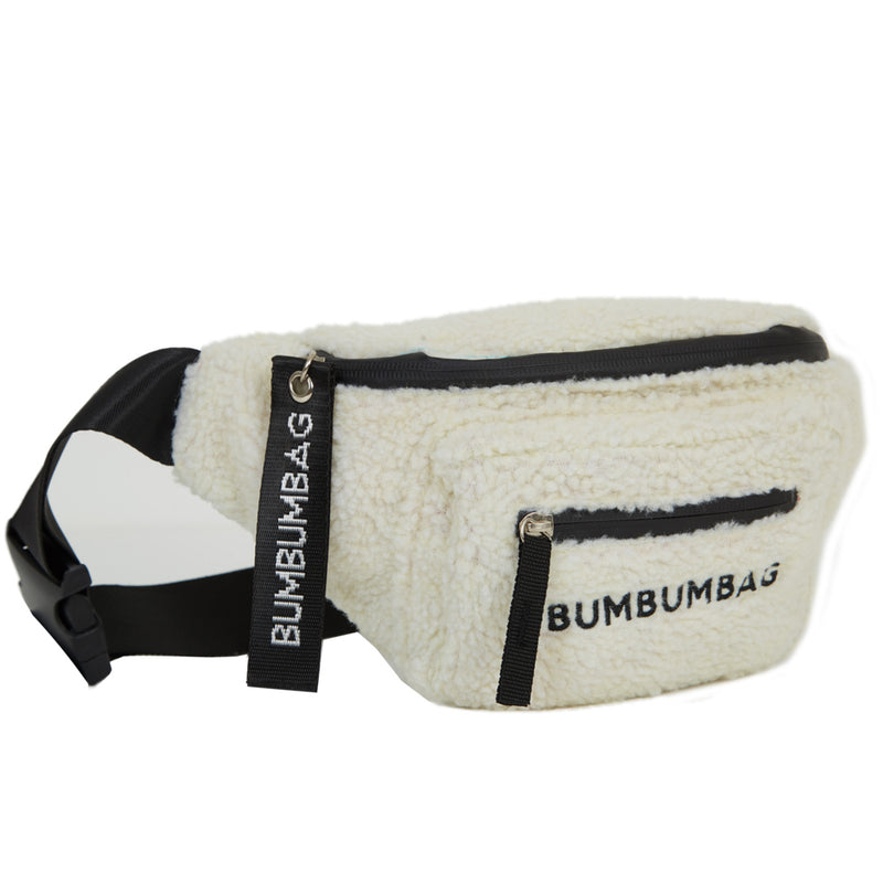 Sac banane Bumbumbag pour homme et femme en sherpa, avec "bumbumbag" brodé à l'avant. Deux compartiments zippés, tirette avec slogan, bandoulière ajustable, fermoir sécurisé. Modèle beige. Dimensions : 28x6cm..