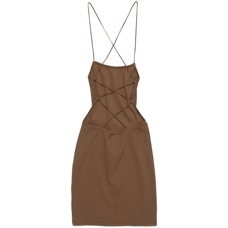 Robe sans manches pour femme de marque Sixth June. Dos ouvert et croisé. Matière lycra, douce et doublée. Coupe moulante, très près du corps, longueur mini. Modèle marron.