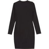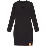 Robe à manches longues pour femme de marque Sixth June. Petite ouverture au centre de la poitrine. Matière légèrement côtelée. Col semi haut, patch orange sur le bas du côté gauche. Coupe moulante, longueur midi. Modèle noir.
