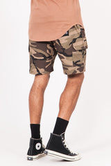 Short Sixth June pour homme en popeline de coton avec poches latérales et poches cargo. Coupe ample, élastique bicolore et cordons de serrage à la taille et poches arrières à revers. Modèle vert camouflage.