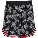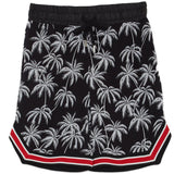 Short Sixth June pour homme avec imprimé petits palmiers façon all-over. Coupe classique longue, design inspiration basketball, cordons de serrage et élastique à la taille, poches latérales et une poche arrière, bandes tricolores à la base et ouverture en forme de V à la base sur les côtés. Modèle noir, blanc et rouge.