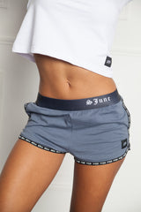 Short bleu Sixth June Femme. Collection Activewear. Bandes noires SJune sur les cotés. Taille élastique noire avec inscription SJune. Lettres S et J au dos.
