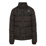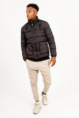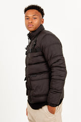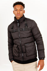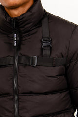 Doudoune courte pour homme de marque Sixth June. Style tactique avec sangles ajustables au niveau des épaules et de la poitrine. Grandes poches cargo avec fermeture à scratch. Fermeture centrale à zip, pattes de serrage à boutons aux poignets. Coupe classique. Modèle noir.